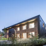 der sakralraum wird zudem geprägt von der ganzglas-fassade, die ihm einen einladenden, transparenten charakter verleiht und den innenraum mit licht flutet. um sonneneinwirkungen zu brechen und gleichermaßen den blick nach außen zu beruhigen, wird die gläserne fassade von doppelwandig transluzenten klappläden aus gepulverten lochblechen umfasst. die goldene farbe der klappläden setzt angenehme kontraste zu der vorvergrauten holzfassade.